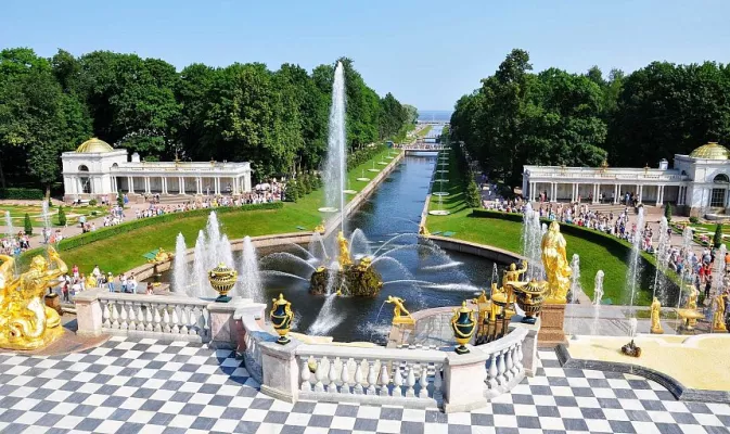 Couramment appelée "Le Versailles russe", l’illustre résidence d’été des tsars impressionne par la démesure de ses jardins et son jeu de fontaines complexe. En été, on y accède par bateau, l’occasion d’une belle balade sur le Golfe de Finlande.