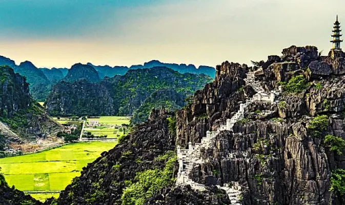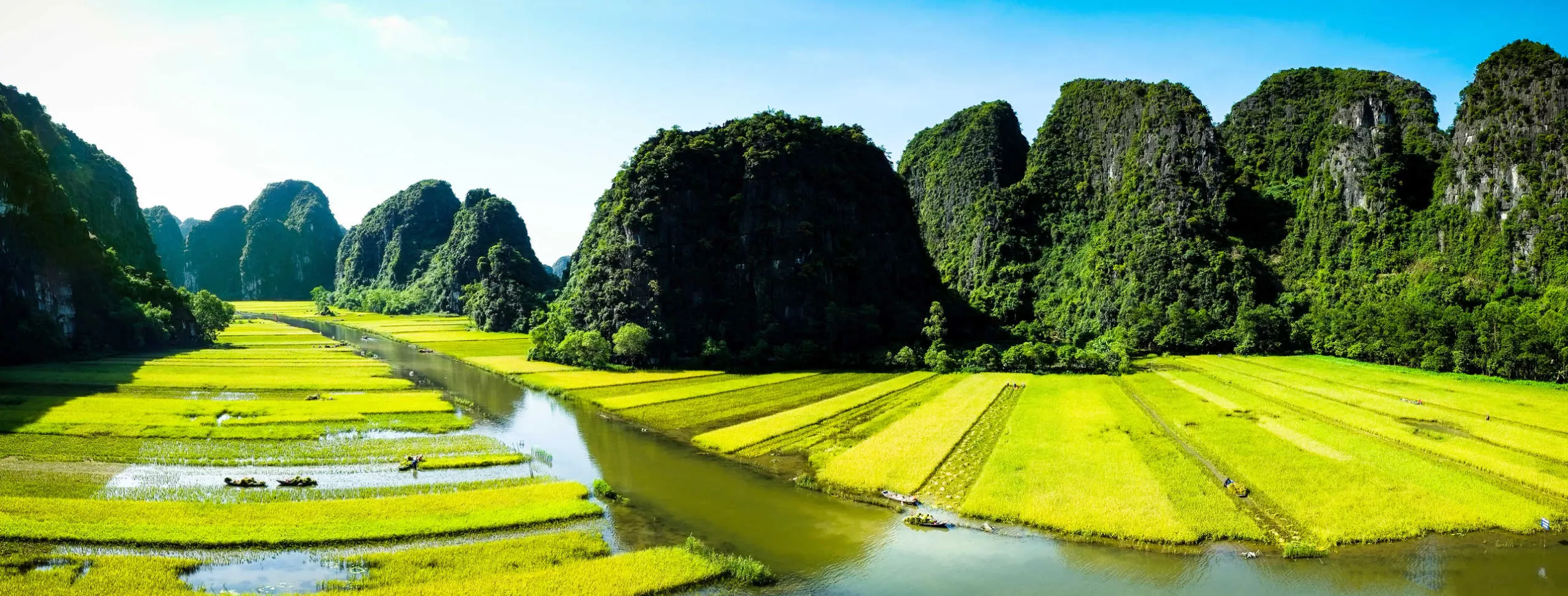Une escale dans la province de Ninh Binh permet de découvrir la Baie d’Halong terrestre, de gigantesques pitons surgissant des rizières.