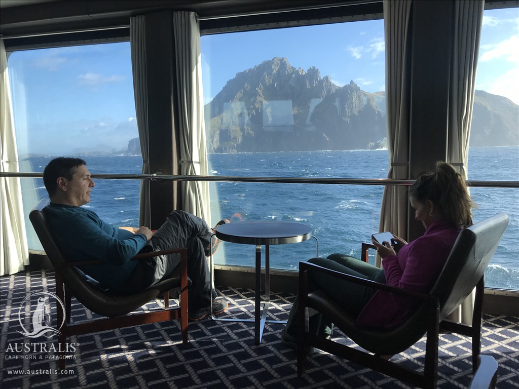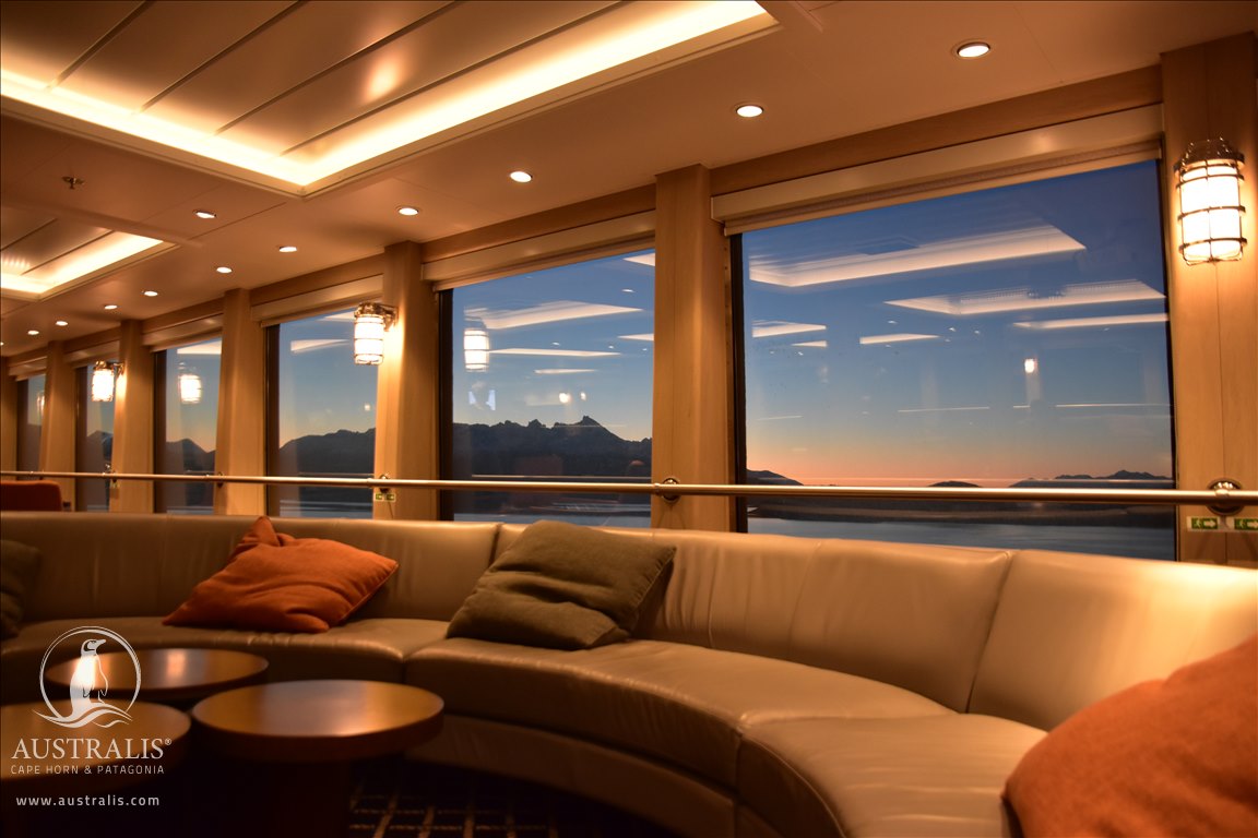 Enfin le salon Darwin situé à l’avant du bateau sur le pont Darwin est certainement le salon le plus prisé. En effet, on retrouvera ici le bar, lieu de partage où les passagers apprécient terminer la journée autour d’un verre de vin chilien ou autre cocktails, favorisant ainsi les rencontres avec les autres voyageurs.