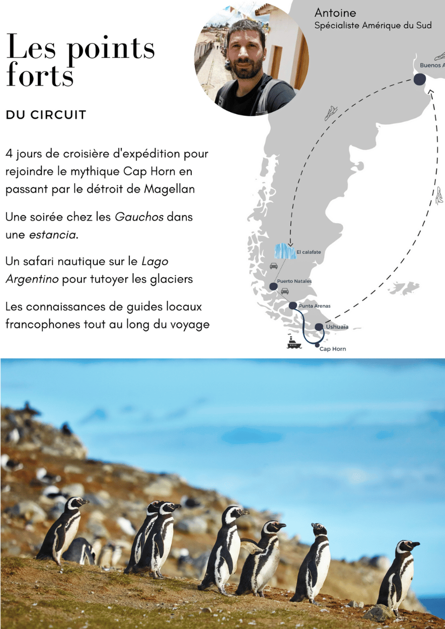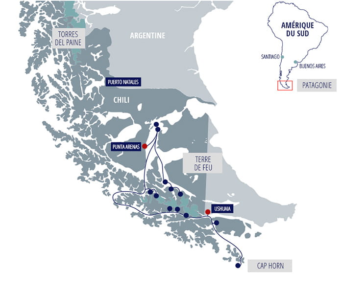 Le voyage d’une durée de 4 nuits, est conçu pour permettre d’explorer les canaux, baies et fjords de la Patagonie et de la Terre de Feu tout en naviguant dans des lieux mythiques sur les traces des plus grands navigateurs : le canal Beagle, le Detroit de Magellan ou encore, le fameux Cap Horn, dernier « bout de terre » du continent américain avant l’Antarctique.