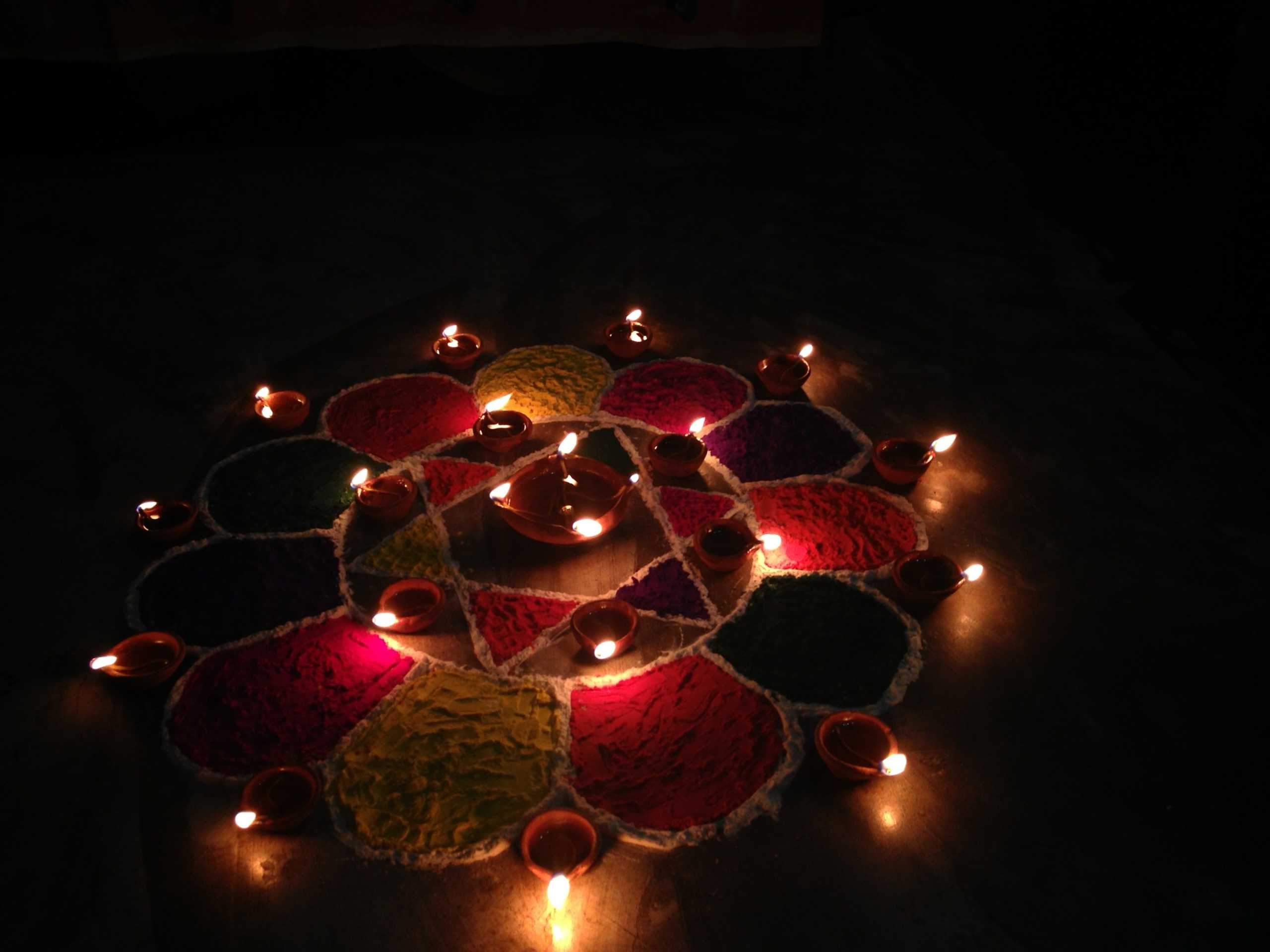 Les réjouissances durent plusieurs jours. Chaque famille purifie puis décore sa maison de rangoli, motifs composés de fleurs et de poudre colorée. Des milliers de lampes éclairent rues et bâtiments. On suspend des guirlandes, des lanternes sont accrochées aux portes et fenêtres, tandis que des feux d’artifice improvisés illuminent le ciel dans un vacarme assourdissant. Diwali est aussi l’occasion de se réunir en famille et d’échanger vœux et cadeaux.