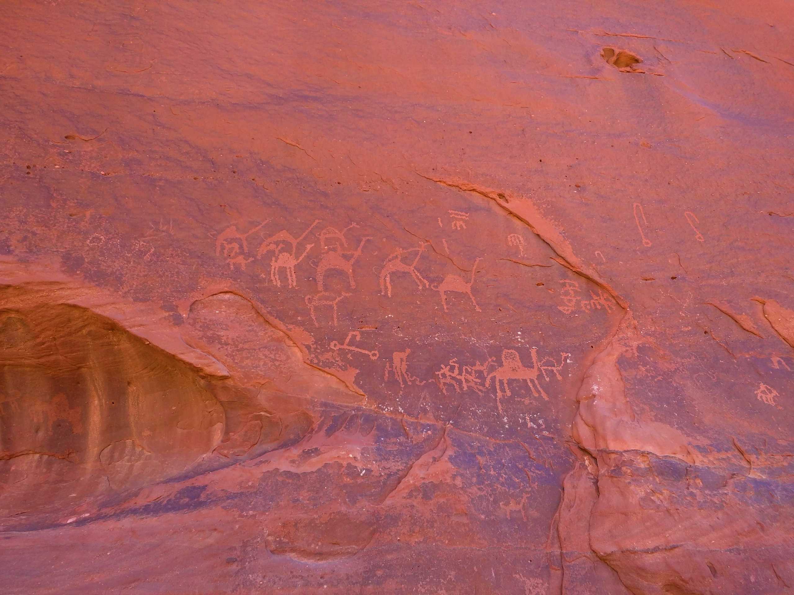 Même si l’Homme a peu laissé son empreinte dans les sables du désert, la roche en a gardé quelques marques : on compte pas moins de 25000 pétroglyphes et 20000 inscriptions gravés dans la pierre, témoins du passage des civilisations au cours des siècles. Dans la faille Aïn Khazali, creusée entre deux falaises abruptes, on peut admirer des gravures de l’époque nabatéenne.