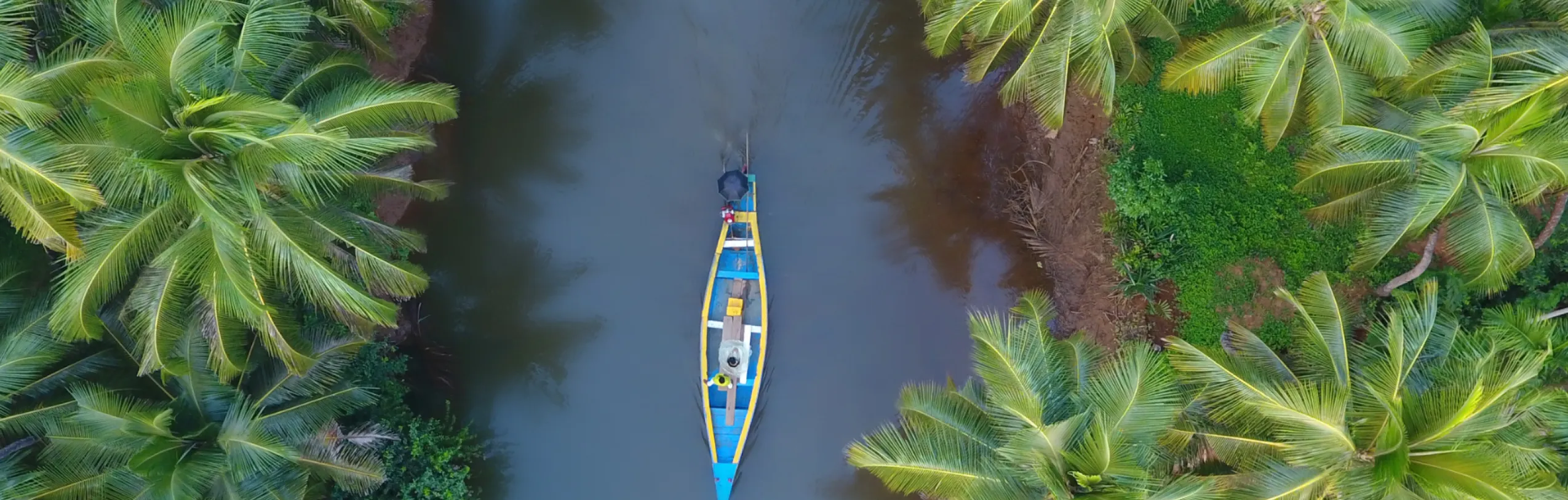 Le Kerala est structuré par un vaste réseau de lagunes et de canaux parallèles à la mer d’Arabie. Ces backwaters constituent un système de circulation essentiel pour les habitants. La navigation permet d’observer un mode de vie organisé autour de l’eau, entre agriculture, pêche et habitat dispersé.