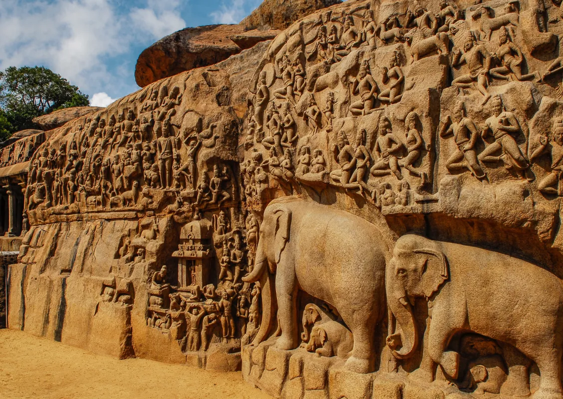 Sur le littoral du Tamil Nadu, Mahabalipuram conserve les traces d’un port actif dès les premiers siècles de notre ère. Les souverains Pallava y ont laissé un ensemble remarquable de sanctuaires et de sculptures monumentales, directement taillés dans le granit. Le site, ouvert sur la mer, frappe autant par la maîtrise technique que par la puissance narrative de ses bas-reliefs, inspirés des grands récits hindous.